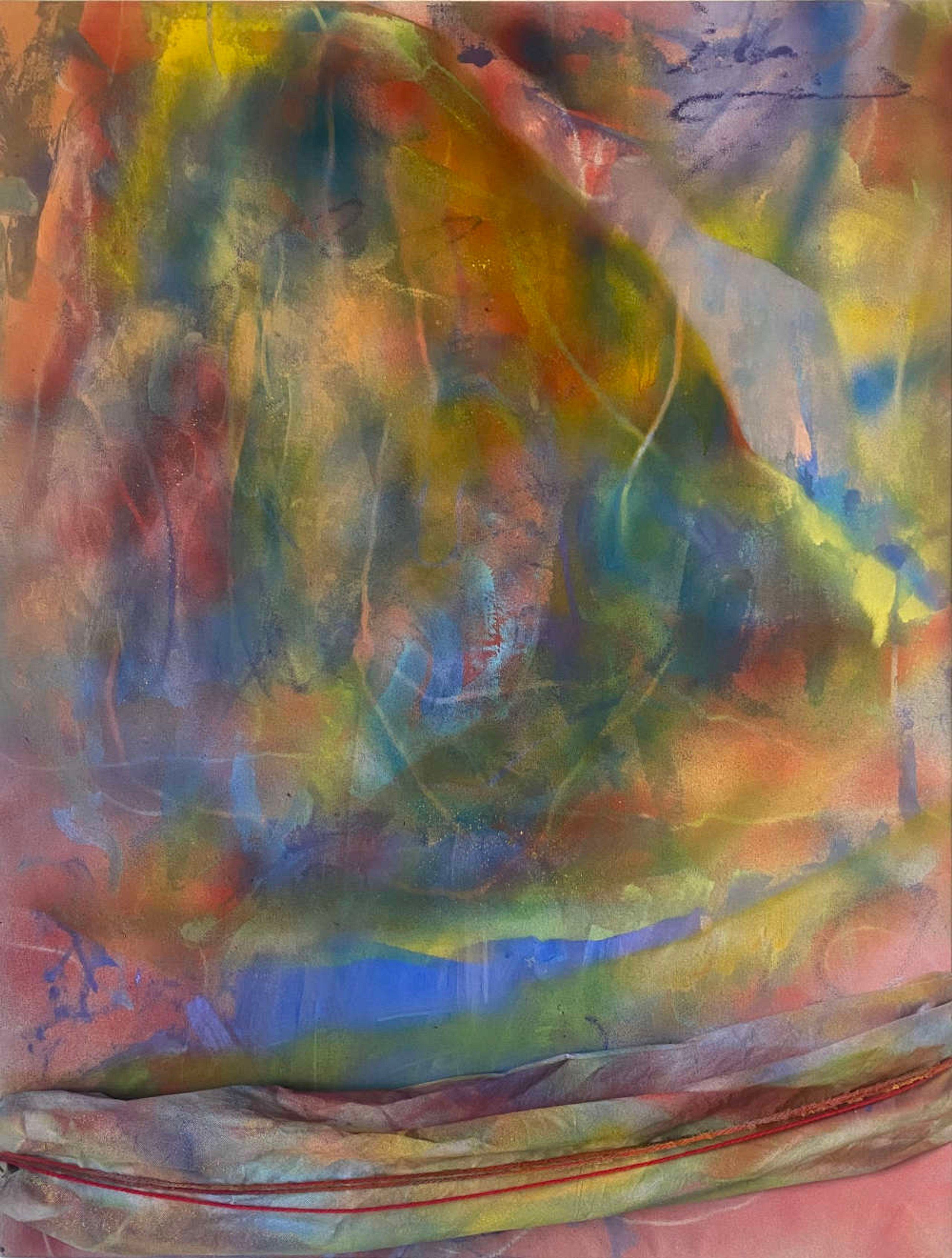 Catherine Maddens y traduit les phénomènes invisibles de l’univers (vortex, nébuleuses, champs énergétiques) à travers des transparences subtiles où se mêlent acrylique, encres et aérosols.