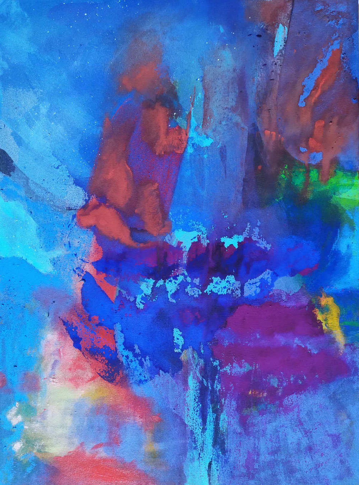 Par superpositions d’acrylique d’encre de gouache et d’aérosol les bleus profonds violets et éclats de lumière composent un paysage céleste intérieur à la fois cosmique et méditatif.